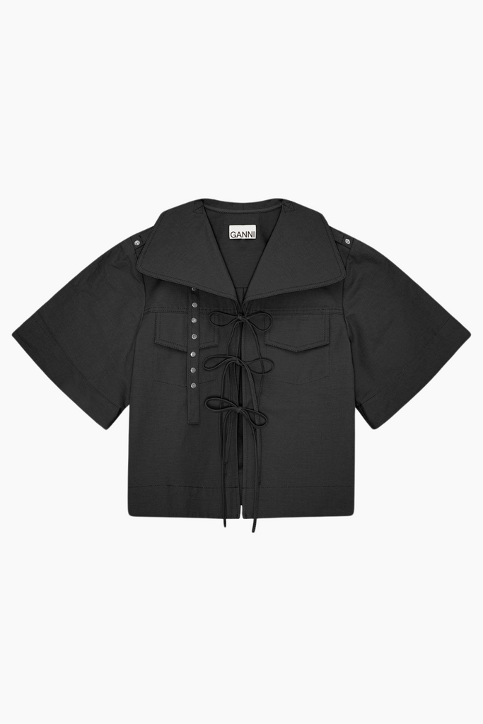 Denne sorte stretchbluse fra GANNI er et moderne bud på den klassiske skjorte – designet med øje for både pasform, funktion og attitude. Det strækbare materiale sikrer bevægelsesfrihed, mens det strukturerede design skaber et skarpt og stilrent udtryk. Blusen har en figursyet silhuet med feminine bindedetaljer i fronten og en elegant, afrundet krave. Uanset om du styler den med jeans for et afslappet look, eller under en blazer for et mere poleret udtryk, vil denne bluse hurtigt blive en alsidig favorit i garderoben.