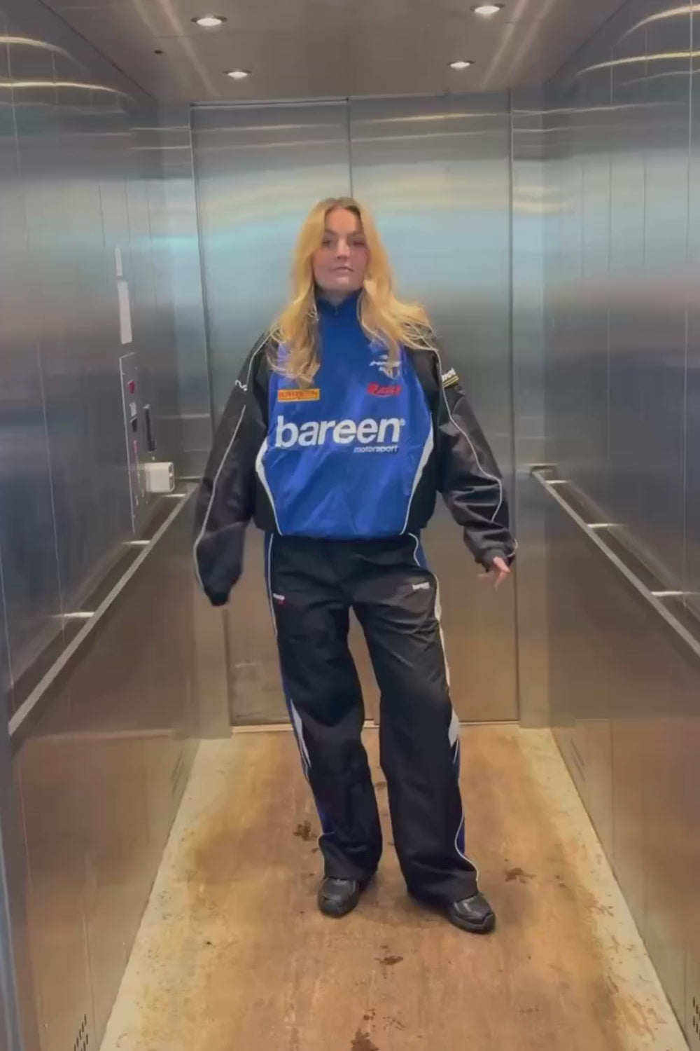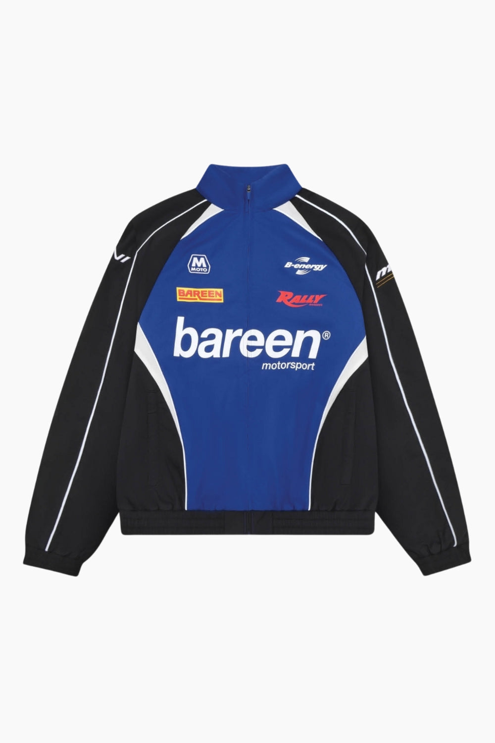 Oversize Track Jacket fra Bareen er inspireret af klassisk motorsport og racing-universet. Jakken er designet i en markant blå og sort farvekombination med kontrasterende hvide paneler og ikoniske logoprints på både front og ryg. Den sporty silhuet kombineres med en let og funktionel kvalitet, der gør jakken ideel som overgangsjakke. Lynlåslukning, høj krave og elastiske afslutninger giver et autentisk racing-look med moderne streetwear-attitude.