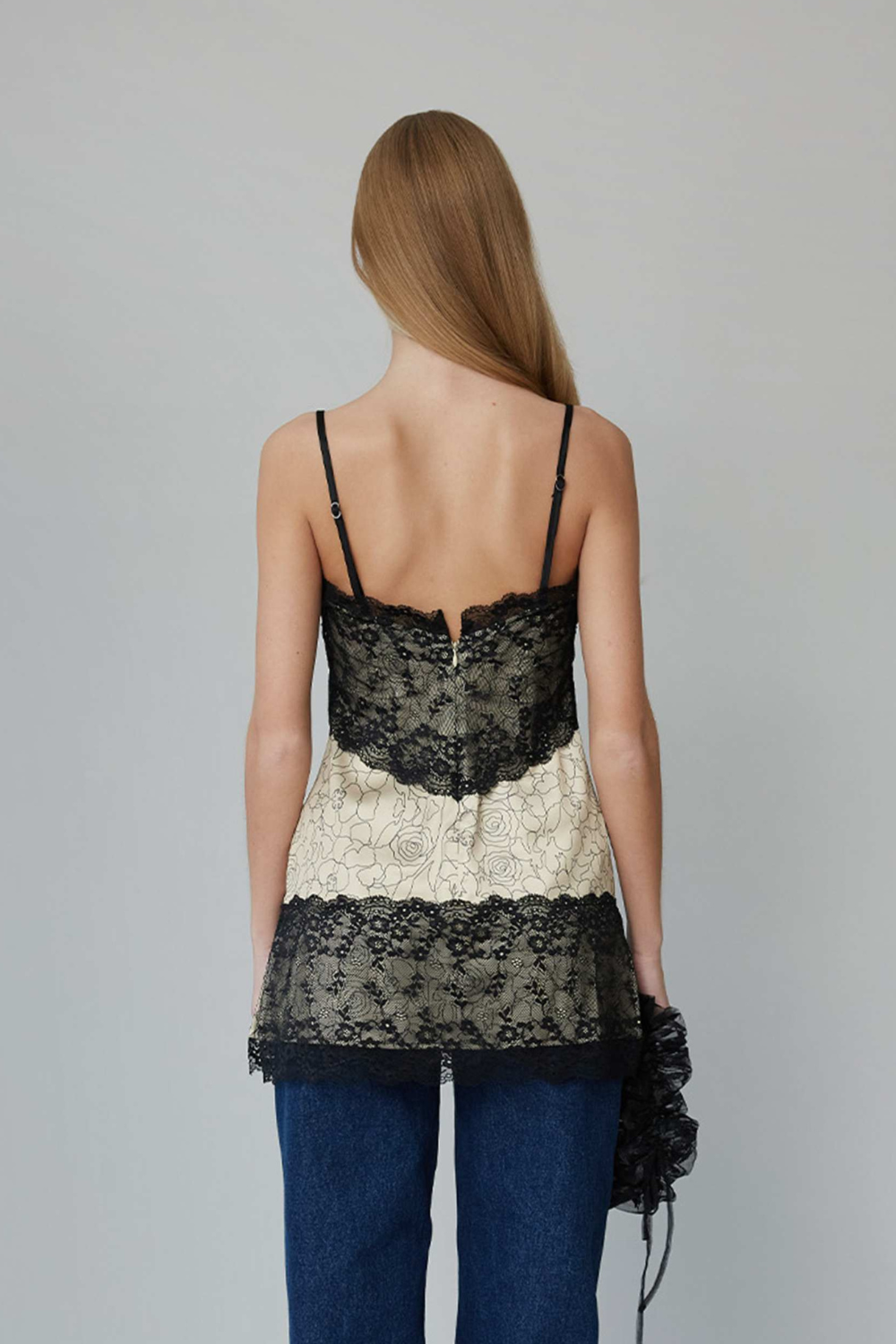 Denne elegante blondetop kombinerer romantiske detaljer med et moderne udtryk. Den cremefarvede base er dekoreret med delikate rosenmønstre og indrammet af sorte blondelag, som giver et sofistikeret spil mellem lys og mørke. De justerbare, smalle stropper sikrer en perfekt pasform, mens den flatterende V-udskæring fremhæver de feminine linjer. Toppen lukkes diskret bagpå og kan styles både til hverdagsbrug med jeans eller til fest med en nederdel eller elegante bukser.