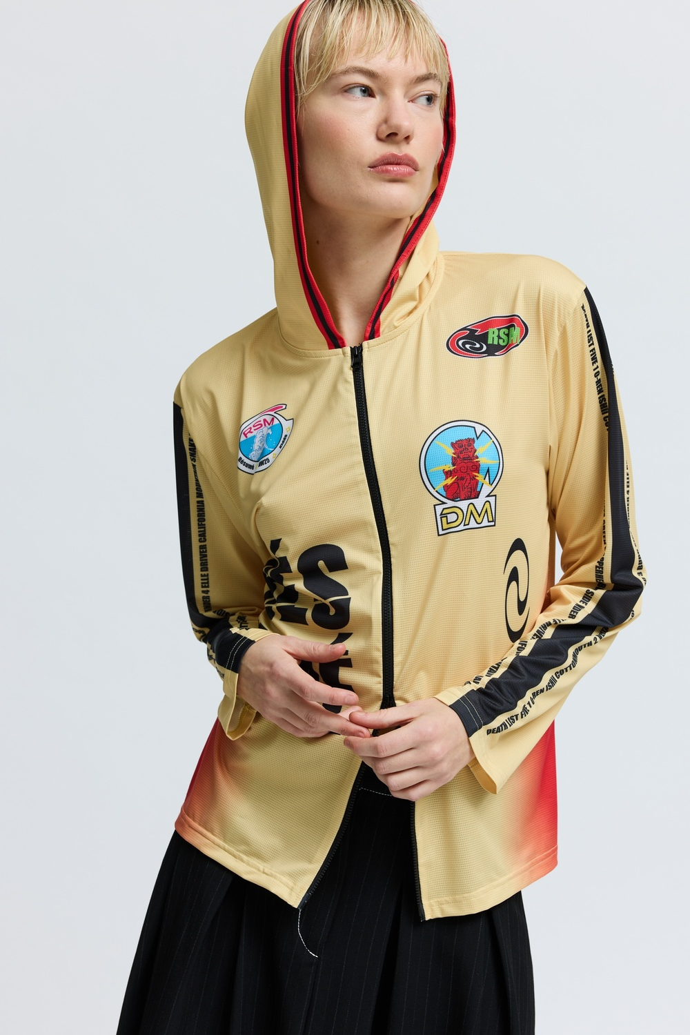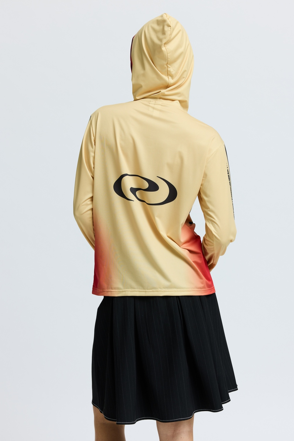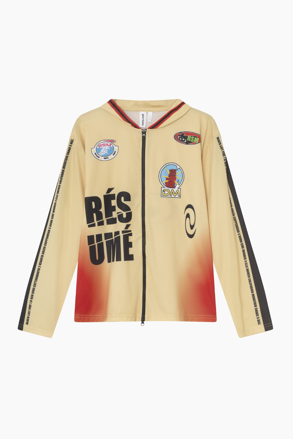 Denne statement-hoodie fra Résumé er et sporty bud på sæsonens mest iøjnefaldende overdel. Den er designet i en let, teknisk kvalitet med lynlås foran og printede grafikdetaljer, der giver et dynamisk og moderne udtryk.Blusen har et gul-til-rødt gradientprint med kontraststriber langs ærmerne og ikoniske Résumé-logoer samt patches foran. Den løse pasform og lette materiale gør den perfekt til lag-på-lag styling - både som en cool overgangsjakke eller som et grafisk element over en enkel t-shirt.