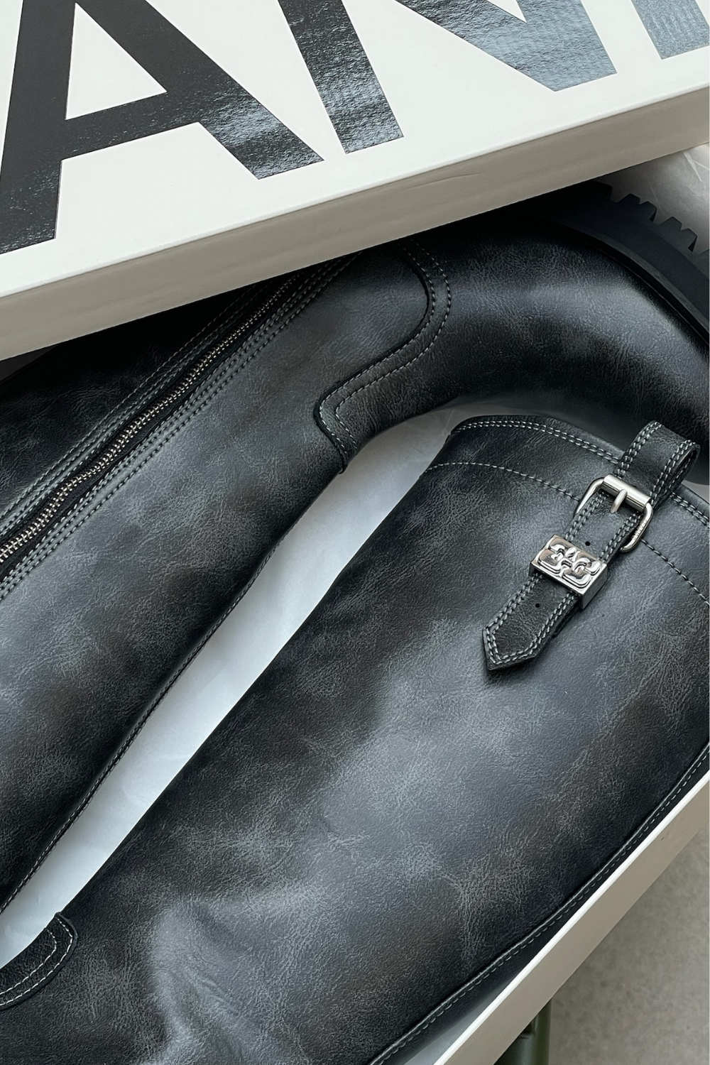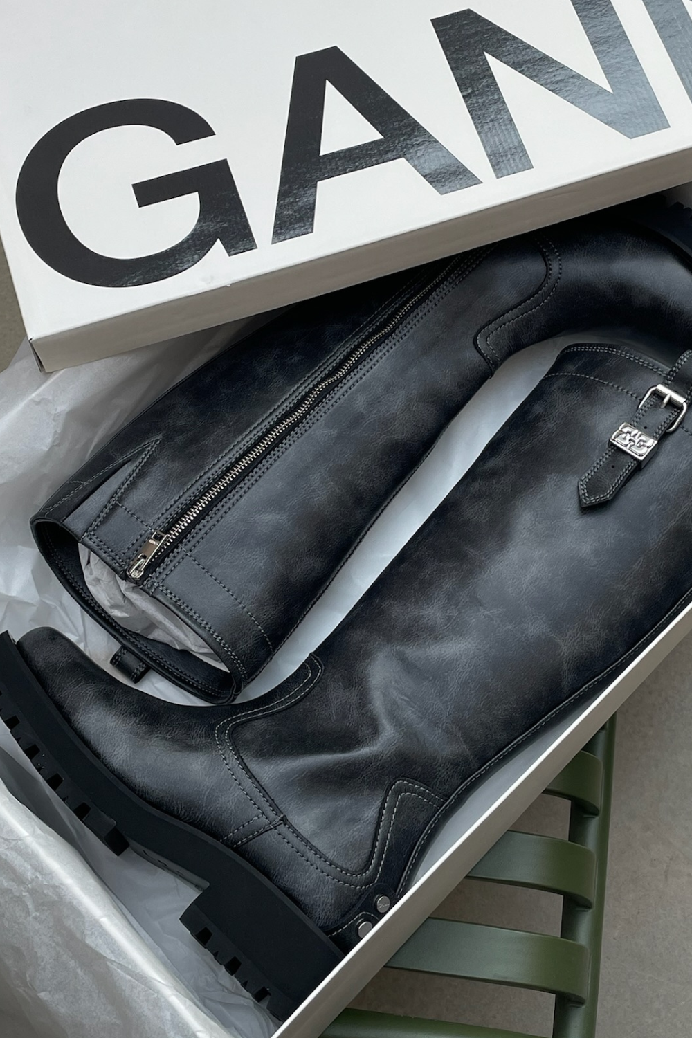 Denne lange støvle kombinerer rå attitude med moderne funktionalitet. Designet i et unikt gråmeleret læderlook med chunky gummisål, giver den både kant og komfort til dit outfit. Støvlen er detaljeret med GANNI logo detaljer, stropper øverst og et diskret logo, der understreger det eksklusive udtryk. Perfekt til at style med kjoler, nederdele eller over jeans for et cool og selvsikkert look hele sæsonen.