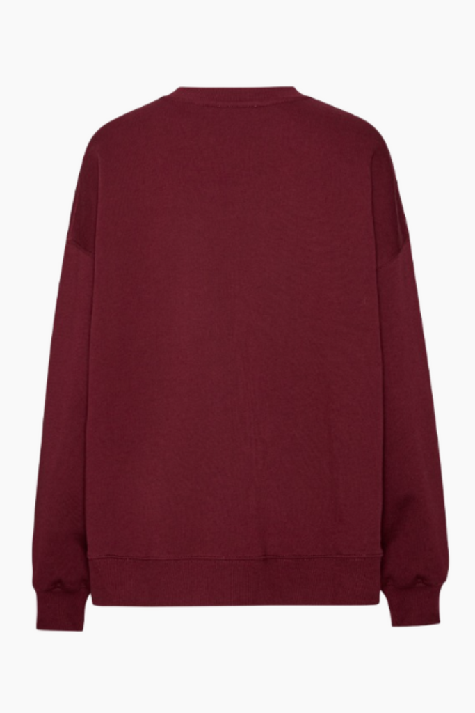 Denne oversized ROTATE sweatshirt kombinerer komfort og coolness i ét enkelt statement-piece. Sweatshirten er fremstillet i en blød og struktureret bomuldsblanding og har et tone-i-tone broderet ROTATE-logo hen over brystet, som giver et eksklusivt og sporty udtryk. Den dybe bordeaux farve tilfører varme til enhver garderobe, mens den afslappede pasform gør den perfekt til både hverdagsbrug og afslappede weekends.
