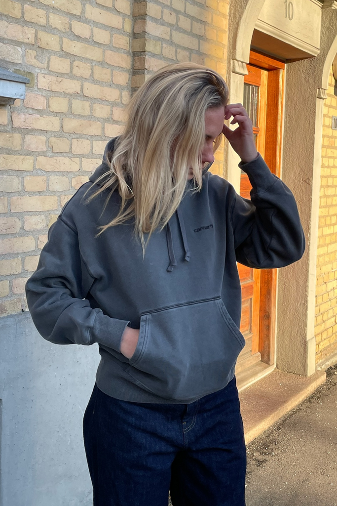 W' Hooded Lumo Sweat i farven Black/Garment Dyed fra Carhartt WIP er en utrolig behagelig og stilren hoodie, perfekt til både hverdag og afslapning. Den er lavet i en blød bomuldskvalitet og har et afslappet loose fit, der sikrer komfort dagen lang. Sweatshirten har en praktisk kængurulomme foran, en justerbar hætte og et diskret "Carhartt"-logo broderet på venstre bryst. Det garment dyed look giver sweatshirten en unik finish og et casual udtryk, der passer til ethvert outfit. Modellen har str. S på