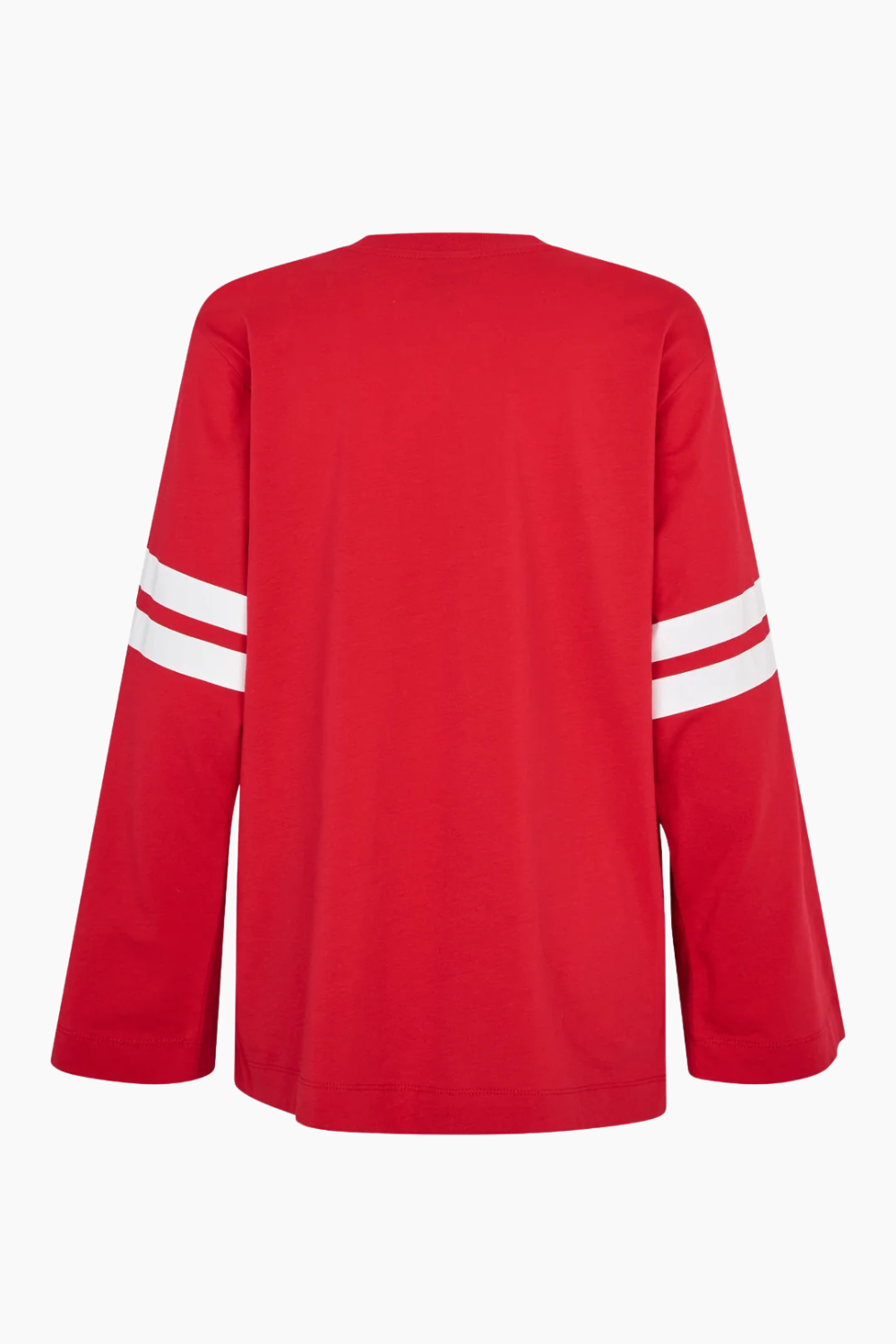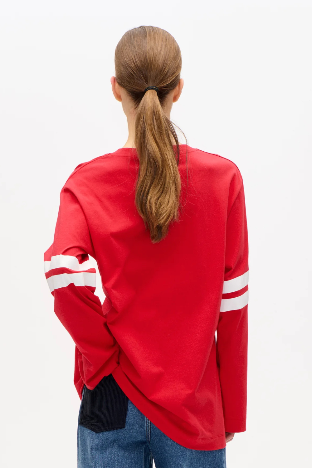 Få et cool, sporty udtryk med denne langærmede rød t-shirt fra Baum und Pferdgarten. T-shirten har en afslappet, oversized pasform og prydes af et stort "99"-print på brystet og hvide striber på ærmerne, som giver et vintage-inspireret jerseylook. En komfortabel og stilfuld tilføjelse til din hverdagsgarderobe