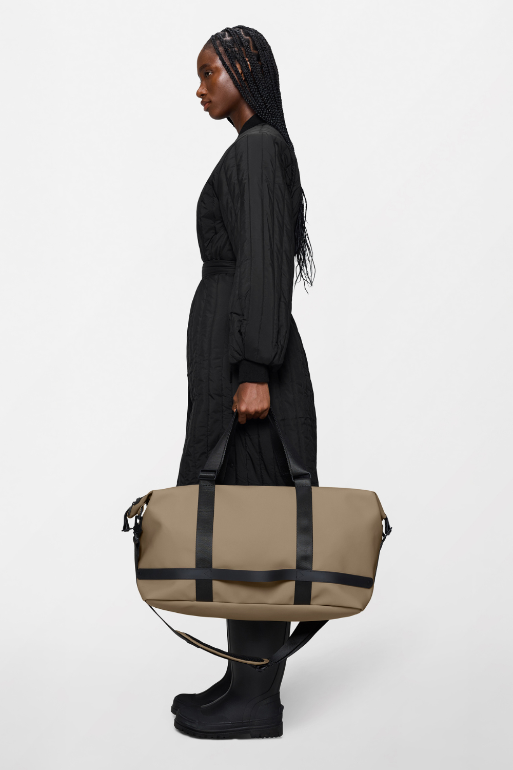 Weekend tasken er fremstillet i Rains’ vandtætte signaturmateriale med svejsede syninger og en W3-vandtæthed, som beskytter indholdet mod let regn. Et stilrent valg til både rejse, træning og hverdagsbrug.