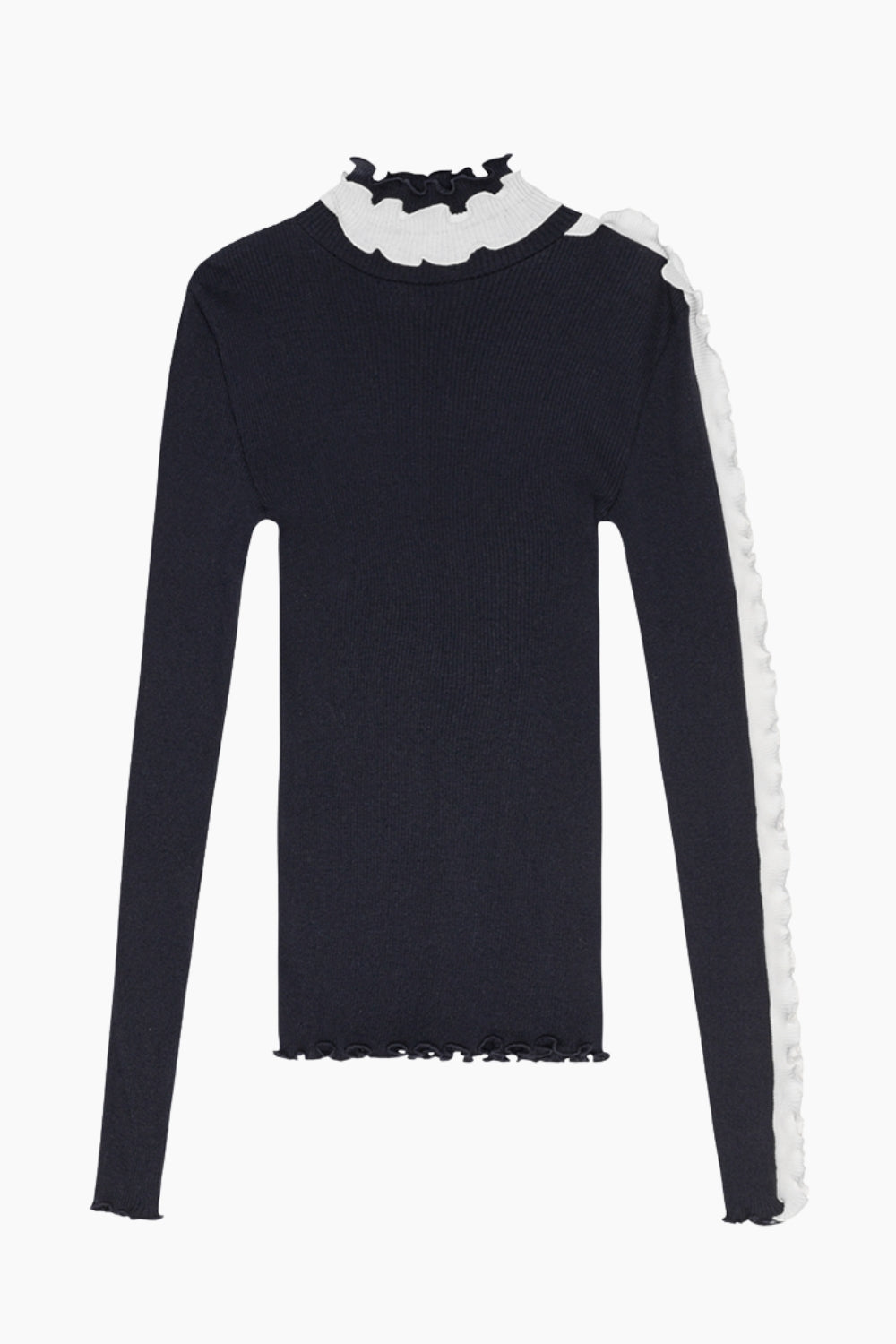 Amelie Seamless Top fra OperaSPORT er en elegant og iøjnefaldende bluse, der kombinerer komfort med et unikt, skulpturelt udtryk. Den er lavet i en blød, strækbar ribkvalitet, som former sig smukt efter kroppen uden at føles stram. Den høje flæsekrave og den kontrastfarvede, bølgede kant langs skulderen og ærmet giver et eksklusivt og kunstnerisk look, der gør toppen perfekt både til hverdagsbrug og mere dressed-up anledninger.