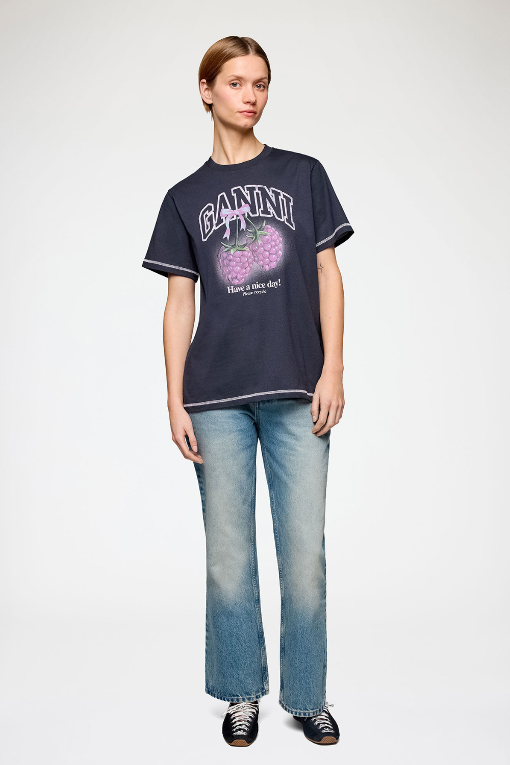 Denne T-shirt fra GANNI kombinerer hverdagskomfort med et legende statement. Designet med klassisk rund hals og korte ærmer får du en tidløs silhuet, mens det iøjnefaldende hindbær-print og budskabet “Have a nice day! Please recycle” tilfører personlighed og kant. Den er fremstillet i 100% økologisk bomuld, hvilket giver en blød og behagelig kvalitet, du har lyst til at bruge igen og igen. Den diskrete GANNI-logo detalje og interlock-kant fuldender udtrykket og gør den perfekt til både jeans, nederdel eller under en blazer for et afslappet, men stilbevidst look.