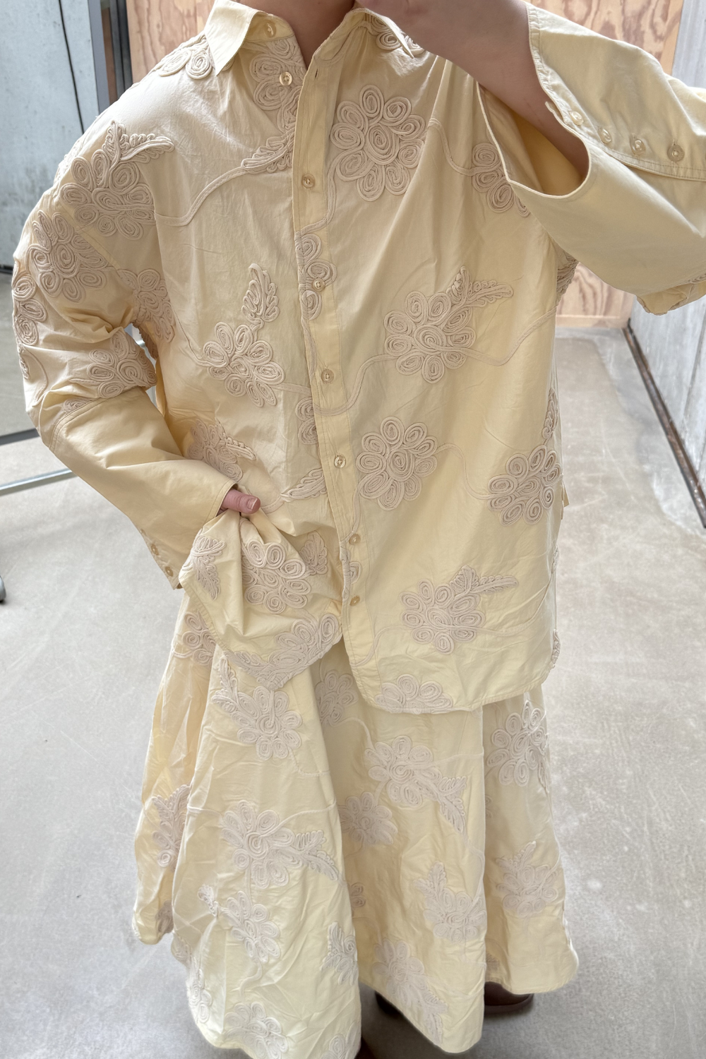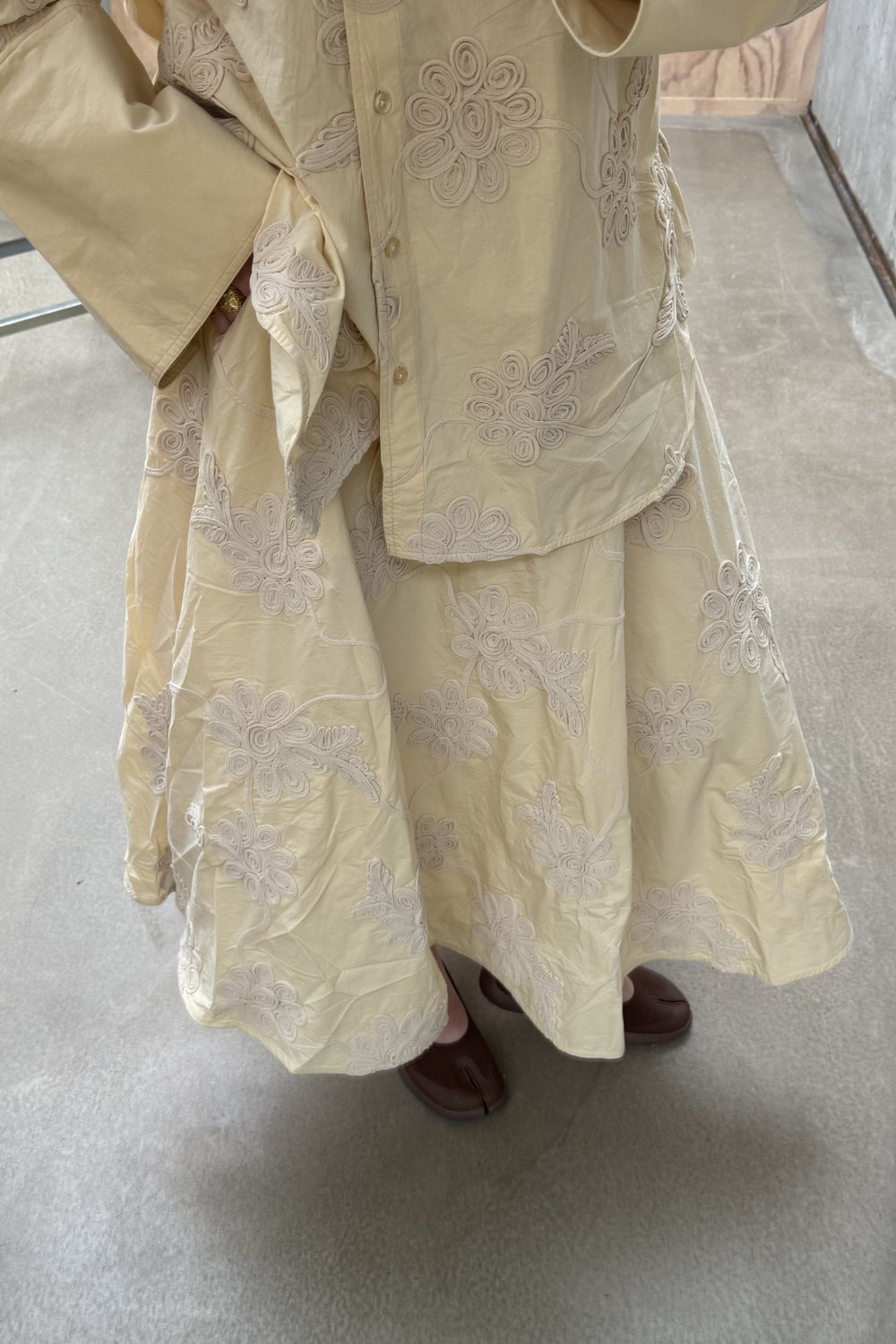 Flower Maxi Skirt i gul er en elegant og feminin maxinederdel med en let og flydende silhuet. Den høje talje fremhæver figuren, mens den voluminøse form giver et smukt og bevægeligt fald. Nederdelen er dekoreret med tonale blomsterapplikationer, der tilfører struktur og et dekorativt, eksklusivt udtryk. Den glatte linning og lynlåslukningen bagpå sikrer en flot pasform, mens det bløde foer gør den behagelig at have på.