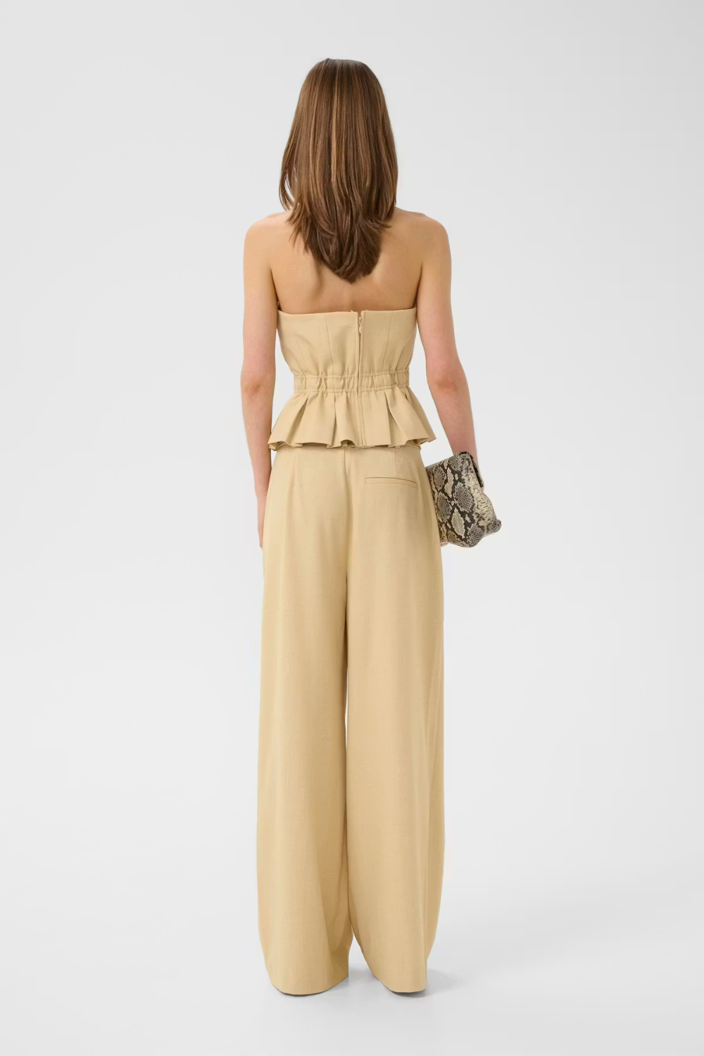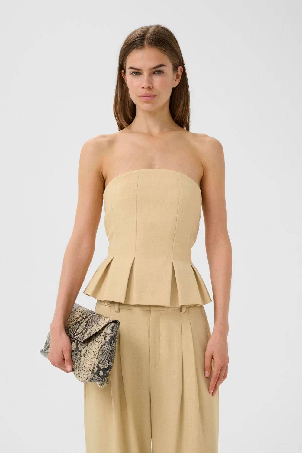 GZStacy Corsage fra Gestuz er en elegant, stropløs top med en figursyet pasform og struktureret silhuet. Den smukke Pale Hay Melange nuance giver et eksklusivt og sofistikeret udtryk, der gør toppen ideel til både festlige anledninger og stilrene hverdagslooks. Den flatterende konstruktion fremhæver taljen, mens den plisserede kant tilfører et feminint og raffineret touch. Designet er rent og minimalistisk, hvilket gør den nem at style – både med matchende bukser, jeans eller en nederdel.