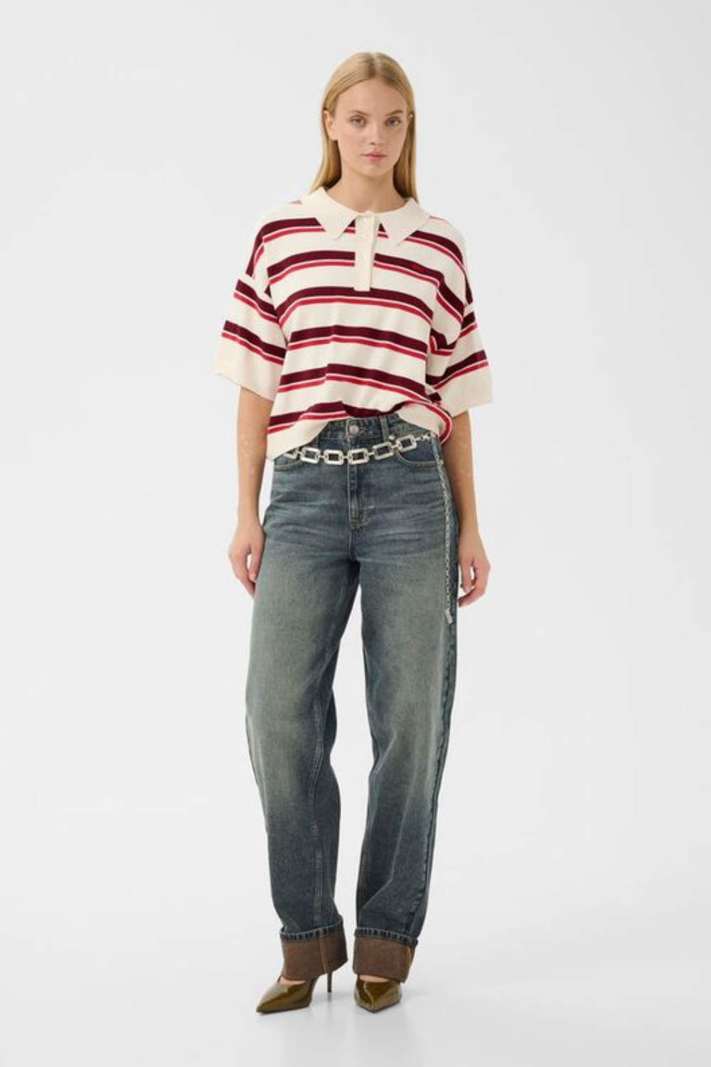 GZTaia SS Polo Pullover fra Gestuz er en moderne strikpolo til kvinder med en afslappet pasform og tidløst design. Farvekombinationen Egret, Cabernet og Poinsettia skaber et elegant og sofistikeret look med et subtilt farvespil. Pulloveren har klassisk krave med knaplukning og dropped shoulders, som giver komfort og bevægelsesfrihed. Den alsidige pasform gør den perfekt til både hverdagsbrug og mere polerede outfits, style med jeans for et afslappet look eller med nederdel og støvler for en smartere stil.