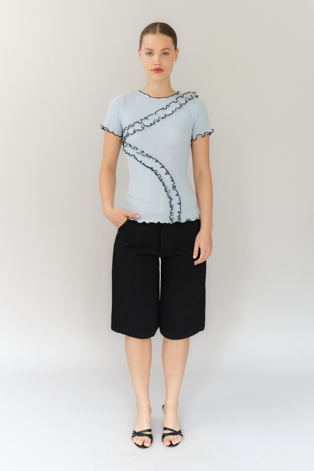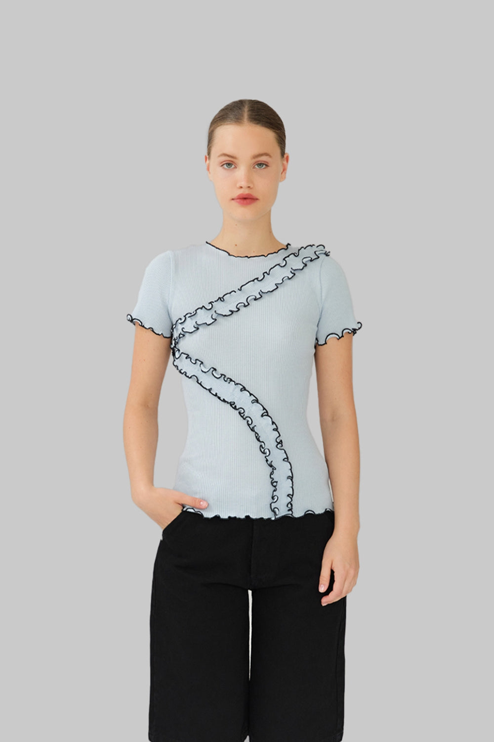 Kaia Seamless Top er fremstillet i 100% økologisk bomuld i en blød babyblå nuance. Den tætsiddende silhuet kombineres med korte ærmer og rund halsudskæring for et enkelt og feminint udtryk. De kontrastfarvede sorte flæsesømme bevæger sig elegant hen over kroppen og tilfører et legende twist, der fremhæver designets form. Den sømløse konstruktion sikrer en komfortabel og flatterende pasform, som gør toppen ideel både til afslappede hverdagslooks og mere styling-orienterede outfits.