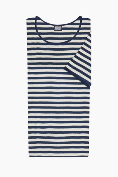 101 Short Sleeve Broadway i farven Marine/Ecru fra Nørgaard på Strøget er en sikker klassiker. Det er en t-shirt med korte ærmer, som er super behagelig at have på. Blusen har en rund halsudskæring samt lavet i 100% bomuld, som både gør den blød og komfortabel at bære. Den klassiske 101 T-shirt, har struktur med vertikale striber, og findes i flere farver, og mønstre. Denne kortærmede, dobbelt stribet t-shirt, i farverne navy og creme er et musthave i enhver gaderobe.