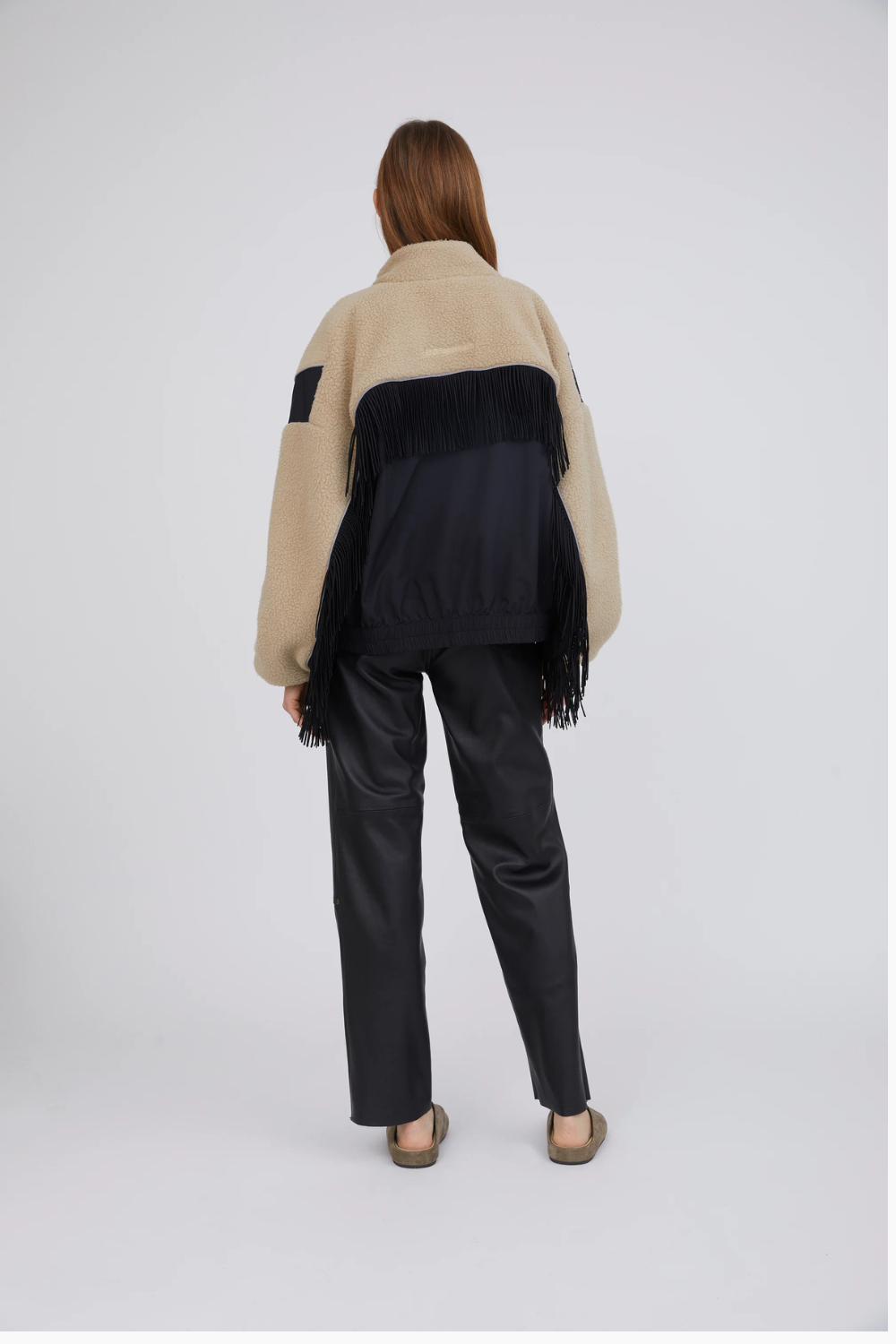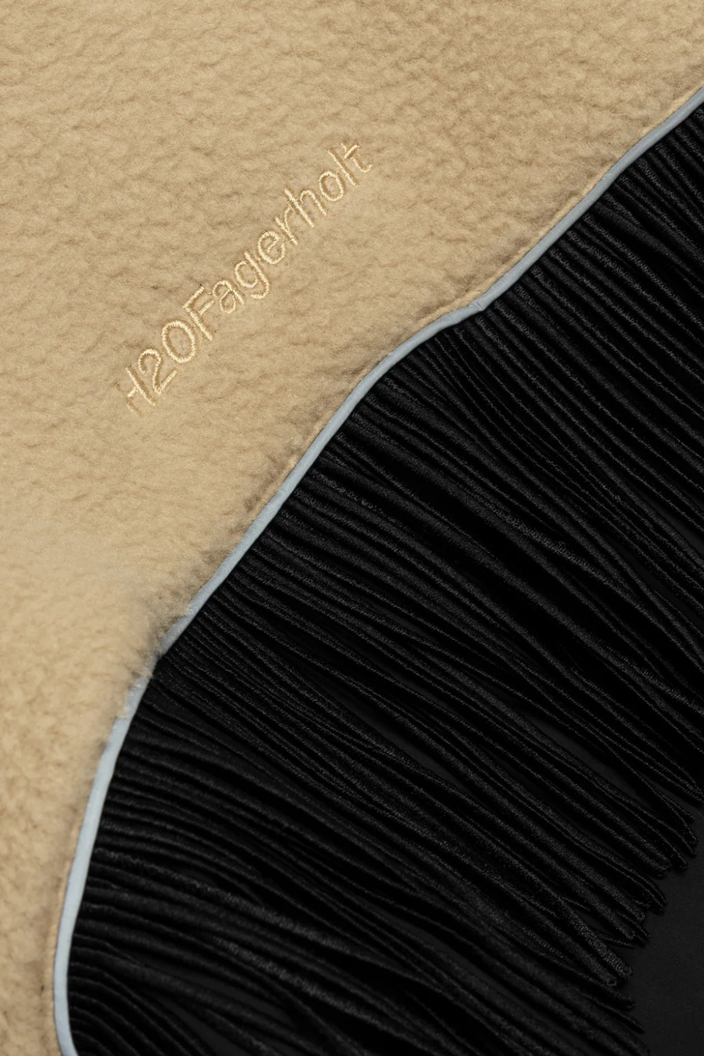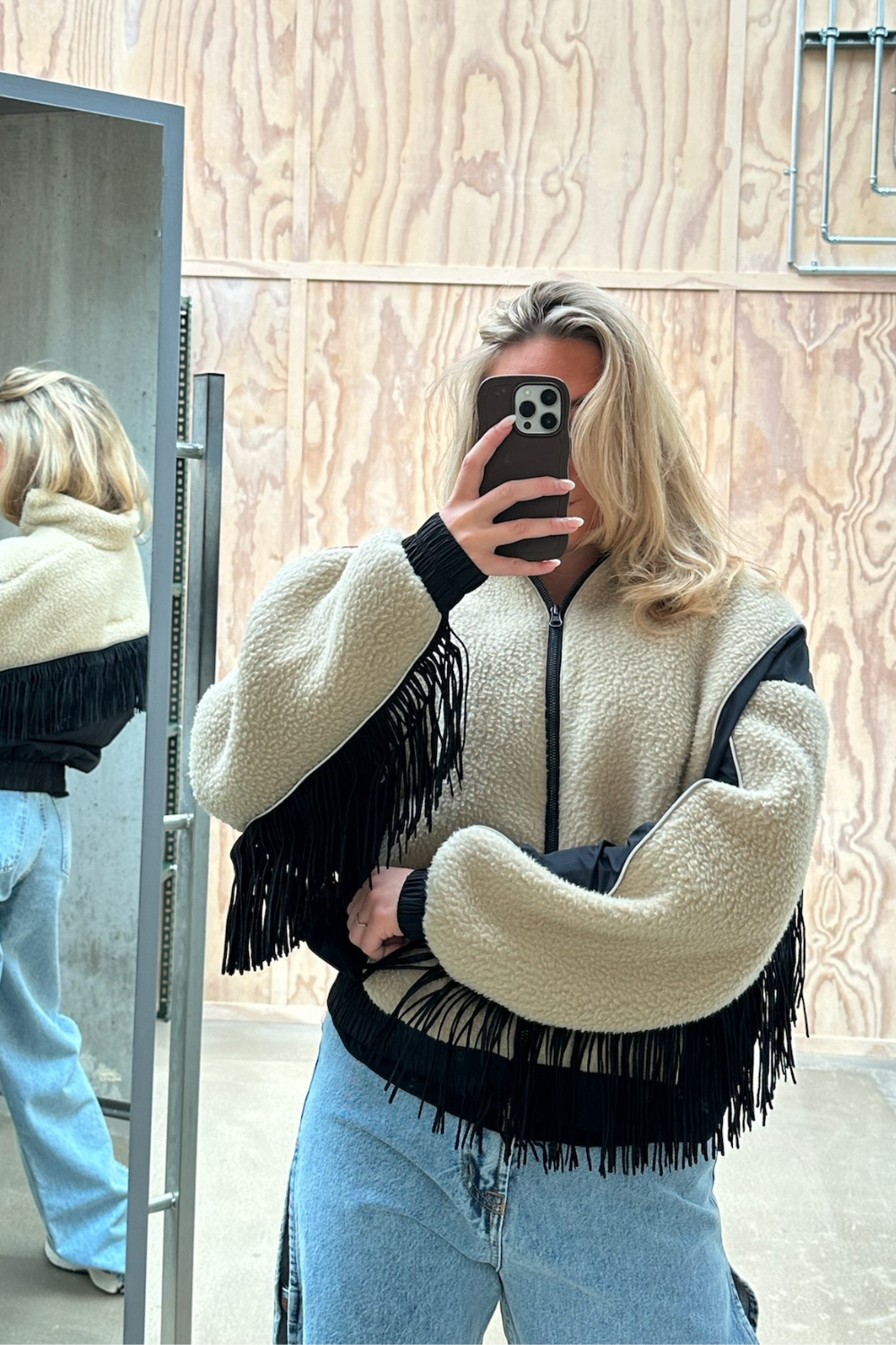26 Jacket i farven Black/Sand fra H2O Fagerholt er en stilfuld fleecejakke med unikke detaljer. Jakken har frynser på ærmerne, der tilføjer et cool look, samt en 2-vejs lynlås, der sikrer fleksibilitet og bevægelsesfrihed. Foran er den udstyret med to skjulte lynlåslommer, mens et broderet logo på ryggen giver et eksklusivt touch. Perfekt som overgangsjakke – style den med dine yndlingsjeans eller et par cool støvler for et råt og trendy look