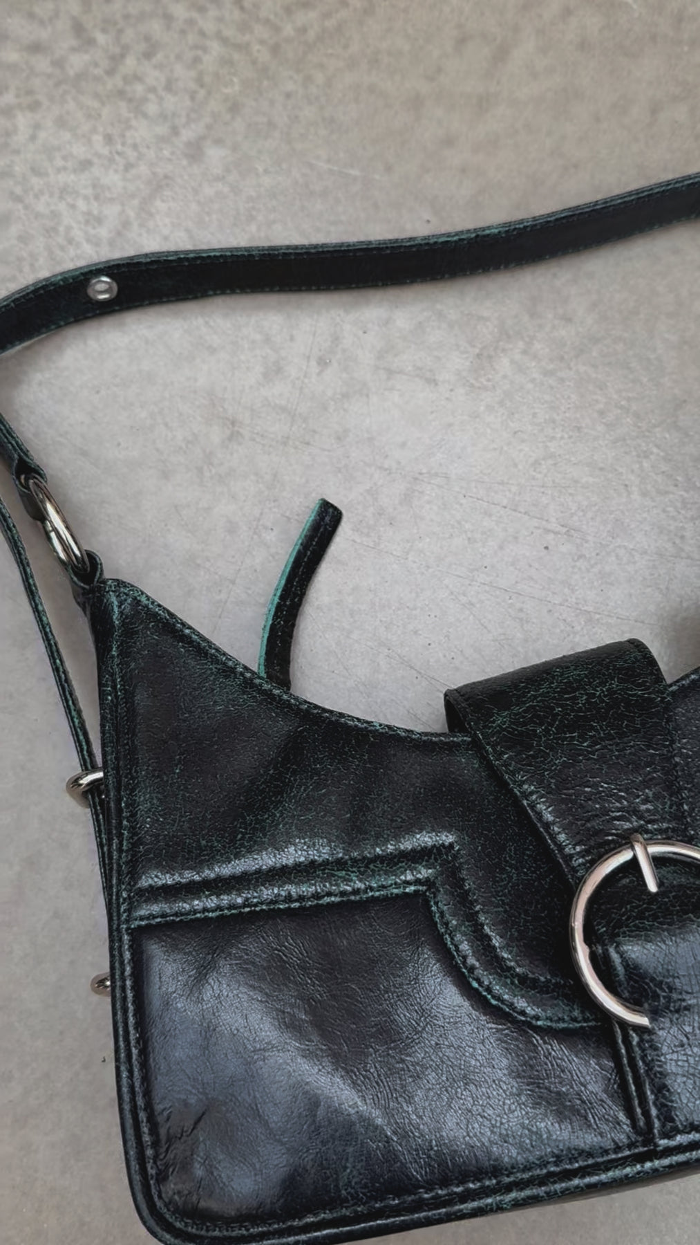 • Farveafsmitning og patinering i det krakelerede læder kan forekomme – især ved kontakt med lyse tekstiler og overflader. Dette er en del af taskens unikke karakter og bør betragtes som en naturlig udvikling af materialet.