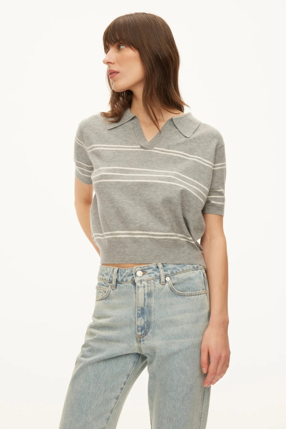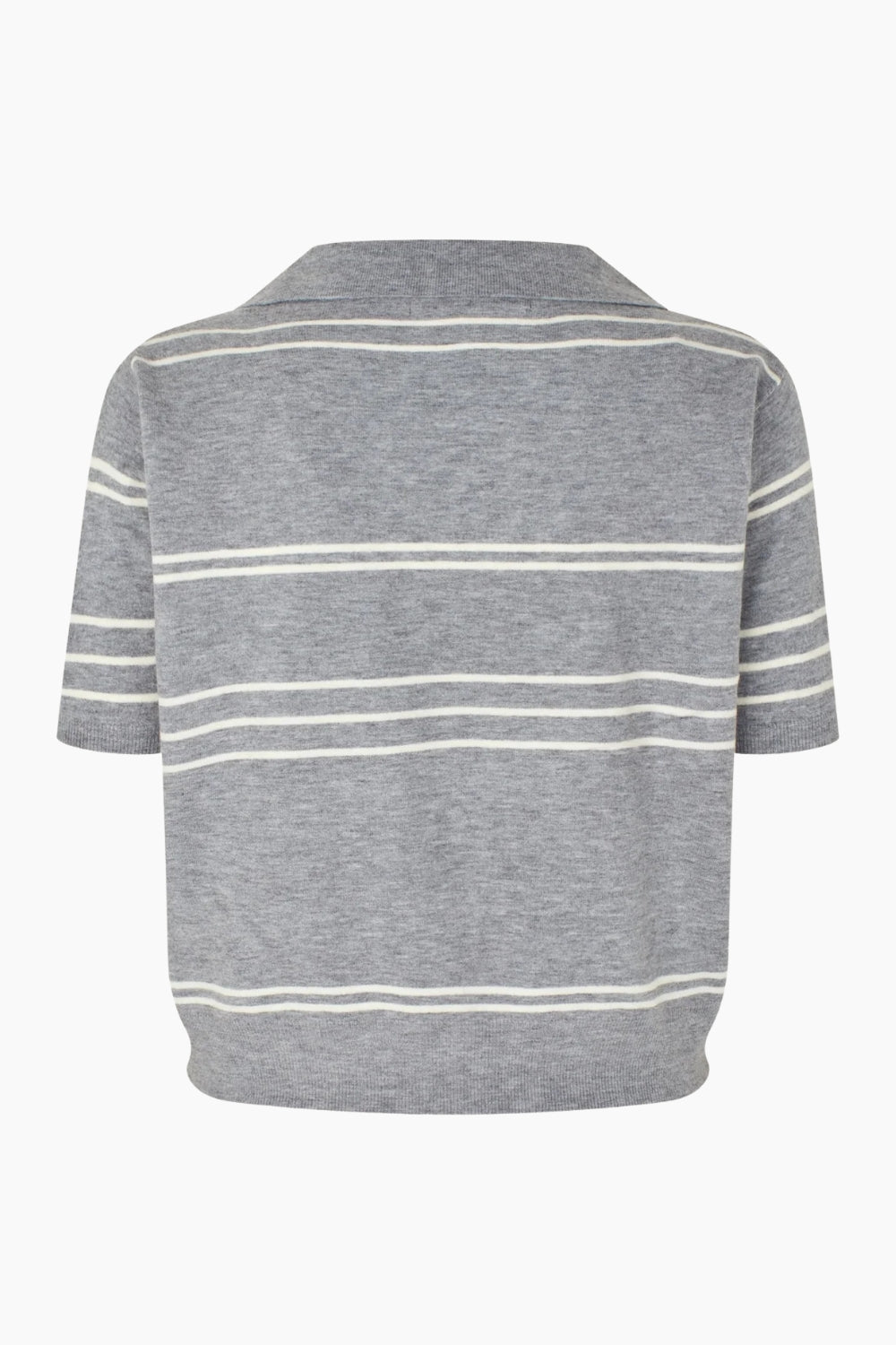 • Blød strikpolo i grå melange med diskrete striber
