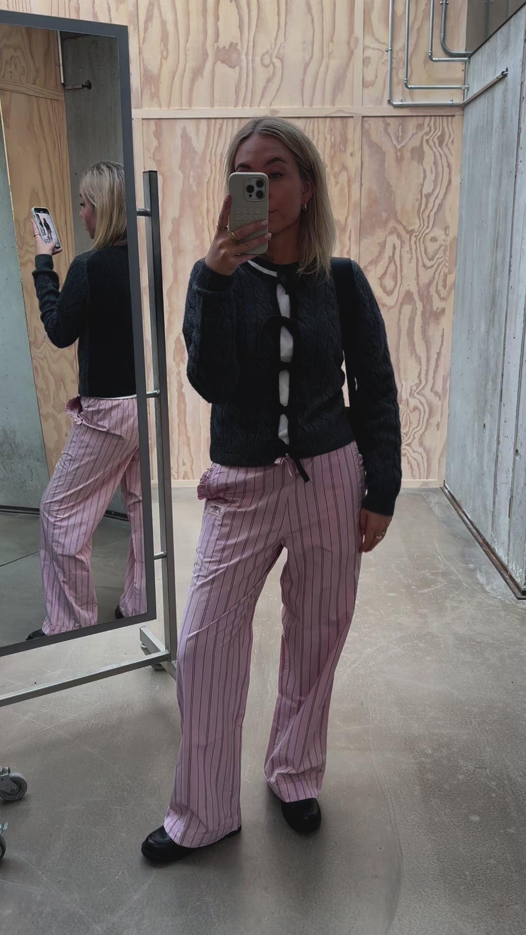 Cashmere Mix Tie String Cardigan K2413 i farven Phantom fra GANNI er en virkelig dejlig cardigan i kabelstrik og med bindebånd foran, der giver et virkelig fint feminint look. Cashmere Cardigan fra Ganni er lavet i de blødeste materiale, merinould og kashmir, i en skøn lysegrå farve med en mørkere grå ved ryggen. Et mindre Ganni logo er broderet ved den ene kant.