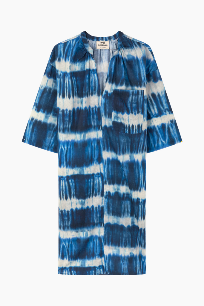 Colin Mana Dress AOP i farven Tie Dye Stripe AOP Merthyl Blue fra Mads Nørgaard er en let oversized kjole med et cool, tie dye print. Kjolen har ærmer til albuerne, en lomme ved brystet samt skjulte sidelommer. Colin Mana Dress er lavet i A facon i et let materiale, som gør den både behagelig at bære samtidig med at det giver et cool udtryk! Kjolen går til under knæene. En dejlig løs kjole, som er perfekt til de varme måneder.