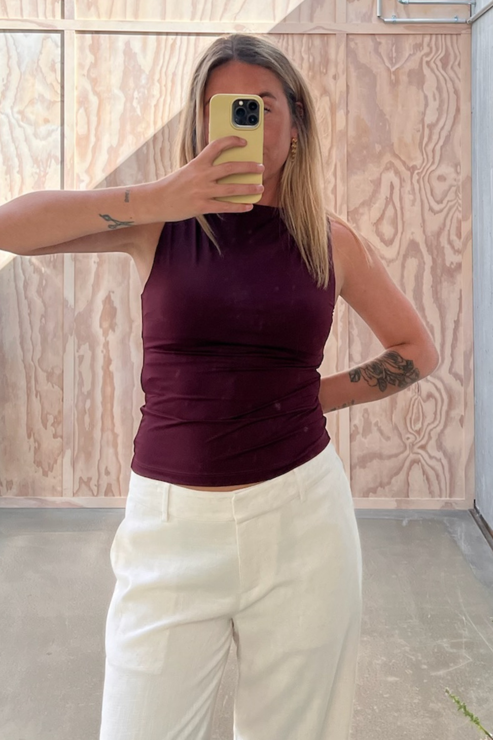 Enscorpion SL Top 7133 i farven Fig fra Envii er en flot elastisk ærmeløs top i blød og glat materiale. Toppen er designet med en bred rund halsudskæring med en stram pasform. Toppen er delvist foret ved brystet.