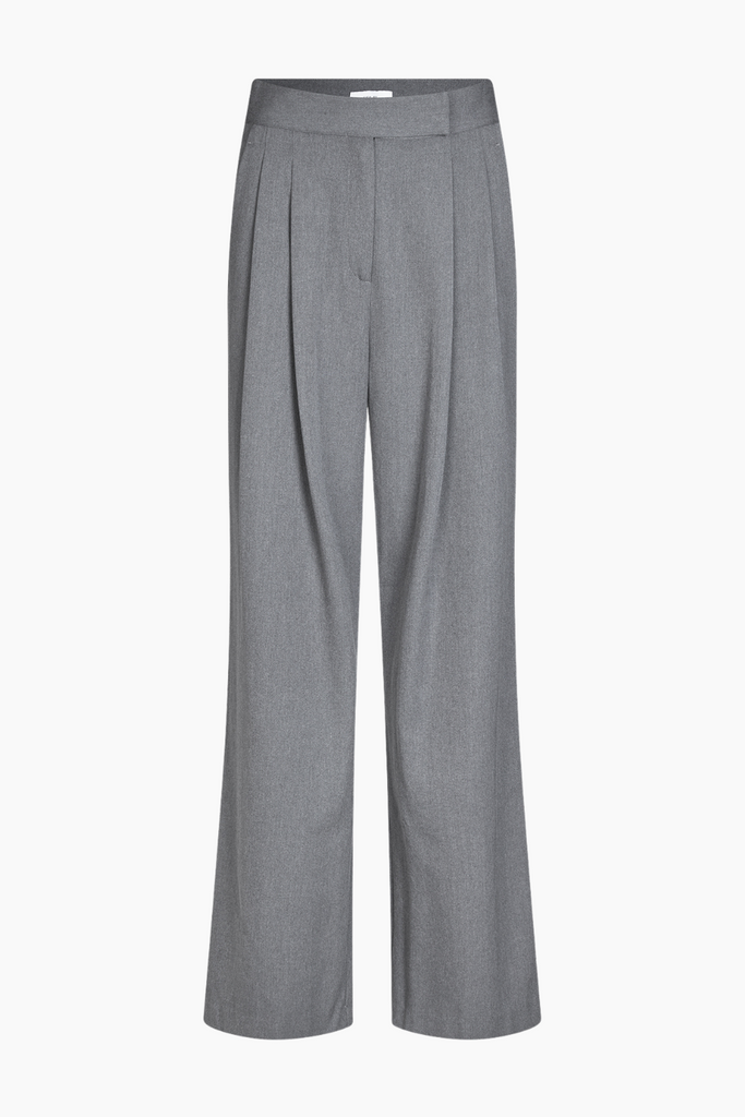 Enwilla Pants 7092 i farven Mid Grey Melange fra Envii er et par grå løse bukser. Bukserne har et loose fit og brede ben, hvilket er med til at give bukserne et cool afslappet look. Bukserne har en skjult lynlås, hægtelukning og lommer i front. Bukserne er størrelsessvarende. Style eventuelt med matchende Enwilla Blazer.