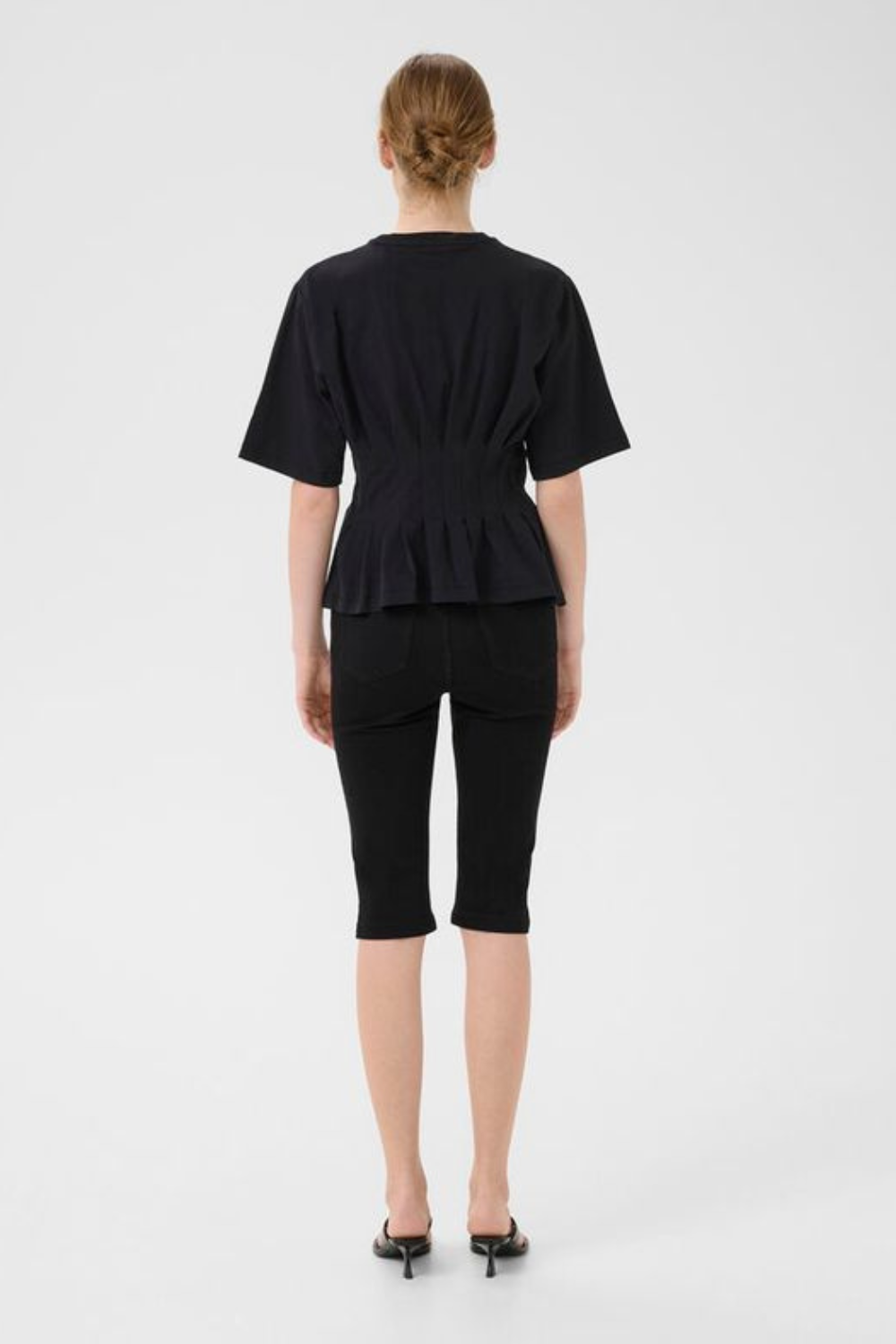 GZInez Tee fra Gestuz er en tætsiddende T-shirt med raffinerede detaljer, der løfter den klassiske basic. De strukturerede syninger tilfører et moderne og skarpt udtryk, mens den plisserede kant forneden elegant fremhæver taljen. Designet har rund hals og brede, korte ærmer, som skaber balance mellem det feminine og det cool. Silhuetten er flatterende og giver et opgraderet take på et casual basisitem, perfekt både til jeans, habitbukser eller nederdel.