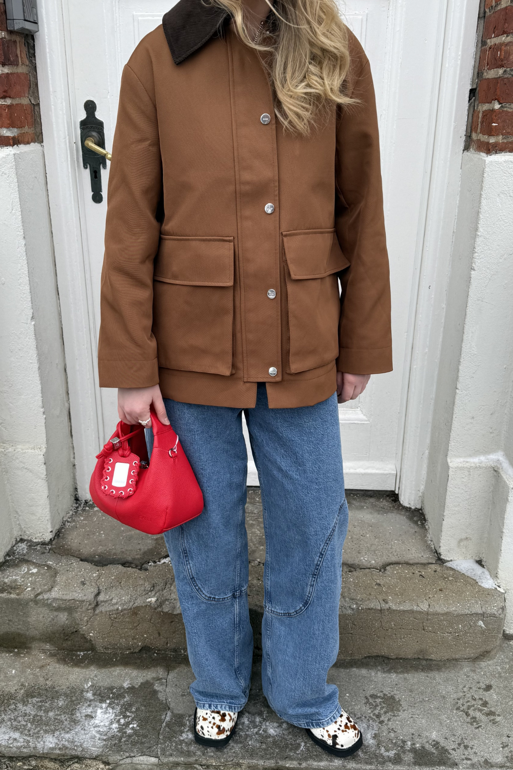 Heavy Twill Jacket A1010221 I Cinnamon Swirl fra GANNI er en cool statement-jakke designet i en flot brunlig farve der giver et moderne og cool udtryk. Jakken har en afslappet, kantet pasform og er detaljeret med en bred fløjlskrave i en kontrasterende brun nuance, som tilfører en vintage-inspireret kant. Jakken lukkes med både lynlås og trykknapper, hvor knapperne er prydet med GANNI-logoet. De to oversized forlommer giver et praktisk element, mens lige ærmer og albuelapper understreger det rå og funktionelle design. På ryggen tilfører en fin wienerlægsdetalje ekstra et flatterende fald.