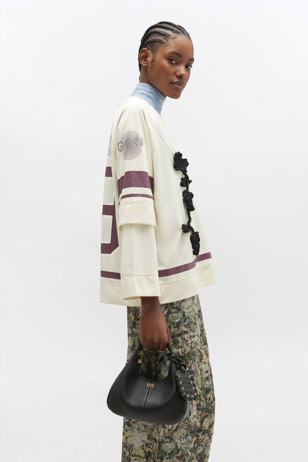 Taskens front har det ikoniske GANNI Butterfly-logo i en elegant guldfinish, mens bagsiden er præget med et diskret GANNI-logo. Som en ekstra fin detalje medfølger en metallisk spejlvedhæng – perfekt til hurtige touch-ups på farten.