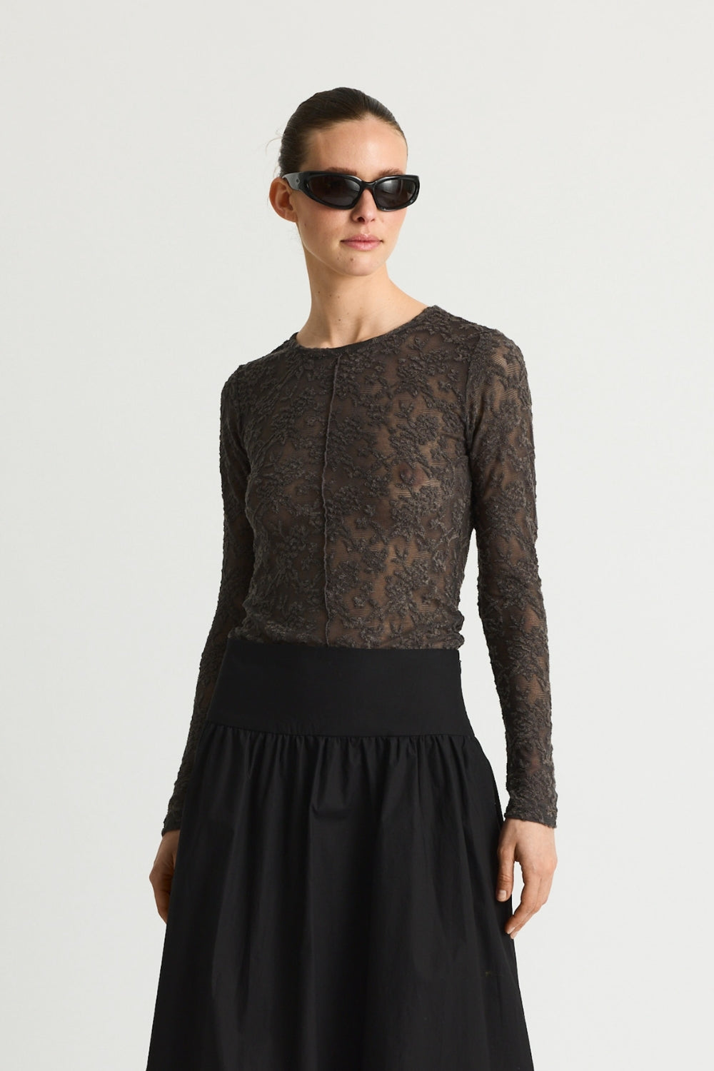 KitRS Blouse i farven Grey fra Résumé er en elegant langærmet top, der kombinerer skabt i et semi-transparent, broderet mesh-materiale med et smukt, detaljerigt blomster-mønster. Den tætsiddende pasform fremhæver kroppens silhuet, mens den rå midtersøm på fronten tilføjer et cool og fashion-forward twist. Perfekt til både hverdag og aften - style den med jeans og ballerinaer for et afslappet outfit, eller kombiner den med en elegant nederdel og hæle for et sofistikeret going-out look.