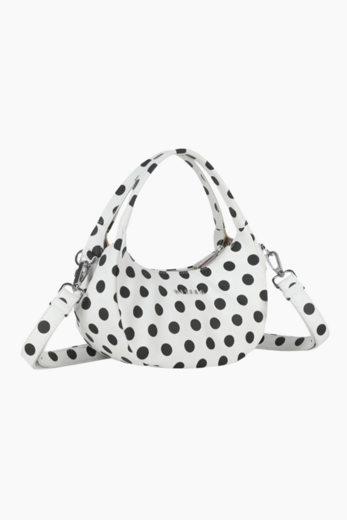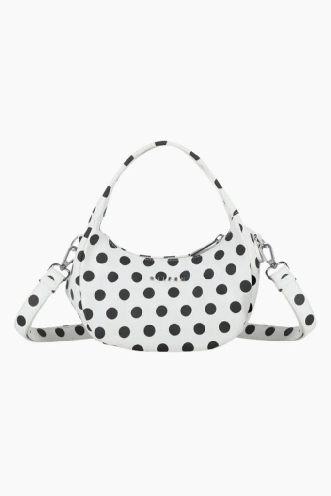 Den prikkede skuldertaske fra Silfen Studio er både sød og edgy – perfekt til at give dit look kant. Taskens halvmåneformede silhuet og iøjnefaldende polkaprint skaber en retroinspireret stil, mens det korte håndtag gør den ideel til både hånd- og skulderbæring. Tasken lukkes med lynlås og rummer lige præcis det vigtigste til hverdag eller en aften ude.