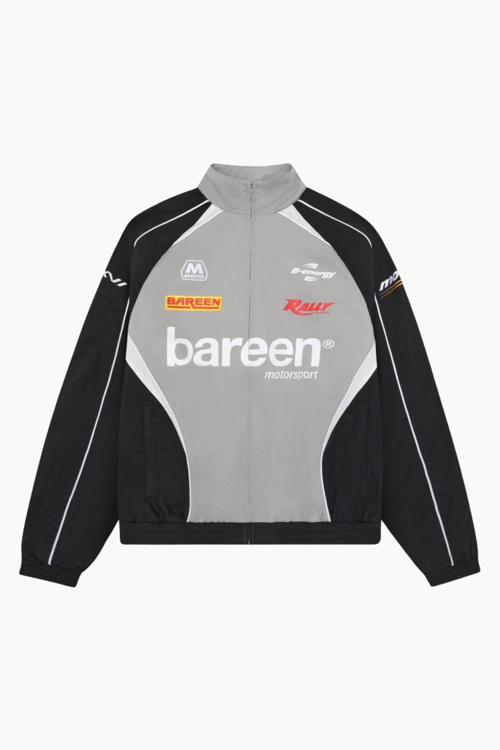 Oversize Track Jacket fra Bareen er inspireret af klassisk motorsport og racing-universet. Jakken er designet i en grå og sort farvekombination med kontrasterende hvide paneler og ikoniske logoprints på både front og ryg. Den sporty silhuet kombineres med en let og funktionel kvalitet, der gør jakken ideel som overgangsjakke. Lynlåslukning, høj krave og elastiske afslutninger giver et autentisk racing-look med moderne streetwear-attitude.