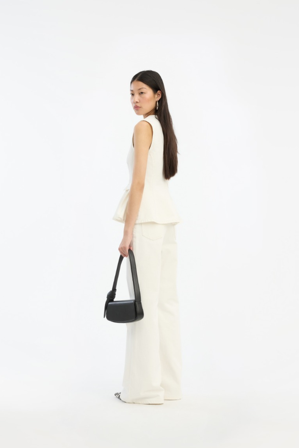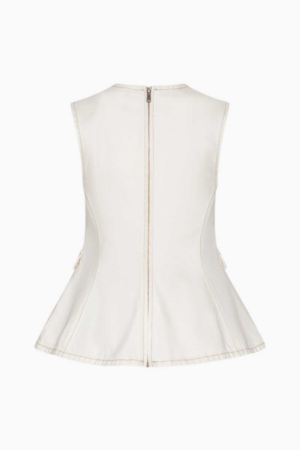 Peplum Denim Top er en moderne og feminin top med et struktureret design. Den ærmeløse silhuet og den runde halsudskæring giver et rent og stilrent udtryk, mens den figursyede overdel med vertikale syninger fremhæver formen. Den markerede peplum-kant tilfører volumen og skaber en smuk kontrast til den tætsiddende overdel. Små flap-detaljer ved taljen og synlige stikninger giver toppen et karakteristisk denim-look. Den lukkes med lynlås bagpå og er fremstillet i økologisk bomuldsdenim uden foer, hvilket giver en autentisk og struktureret følelse. Perfekt til både jeans, nederdele eller skræddersyede bukser.