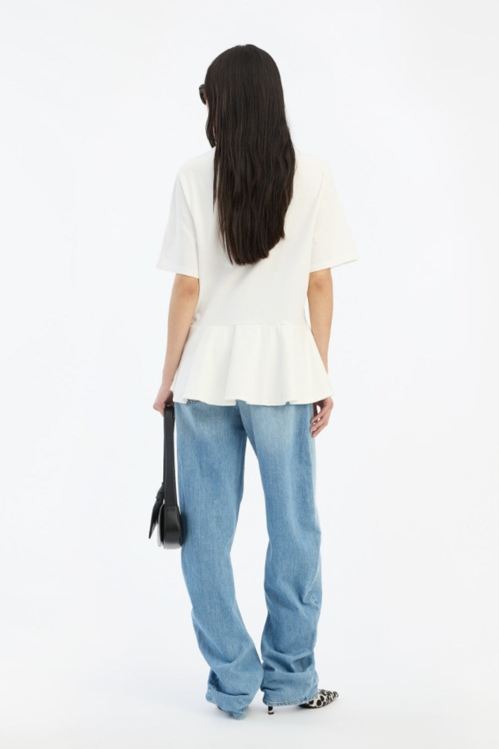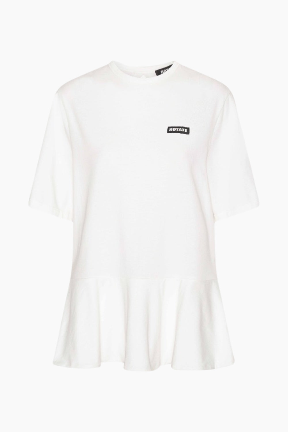 Peplum T-shirt fra Rotate kombinerer et klassisk, casual udtryk med en feminin silhuet. Den er designet i en blød, struktureret kvalitet og har en rund rygudskæring. Den markerede taljeskæring skaber en flatterende form og tilfører et elegant twist til den ellers enkle T-shirt. Det diskrete Rotate-logo på brystet understreger det minimalistiske udtryk.