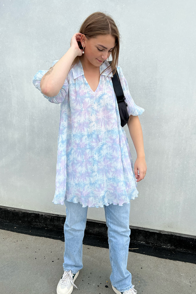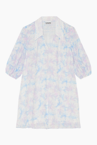 Pleated Georgette V-neck Mini Dress i farven Cherry Blossom fra GANNI er en smuk og behagelig kjole, der går til lige over knæene og er lavet i et fint print. Kjolen har brede ærmer og krave, den er lavet ud af 100% genanvendt polyester, og er en del af GANNI AW22 kollektionen.