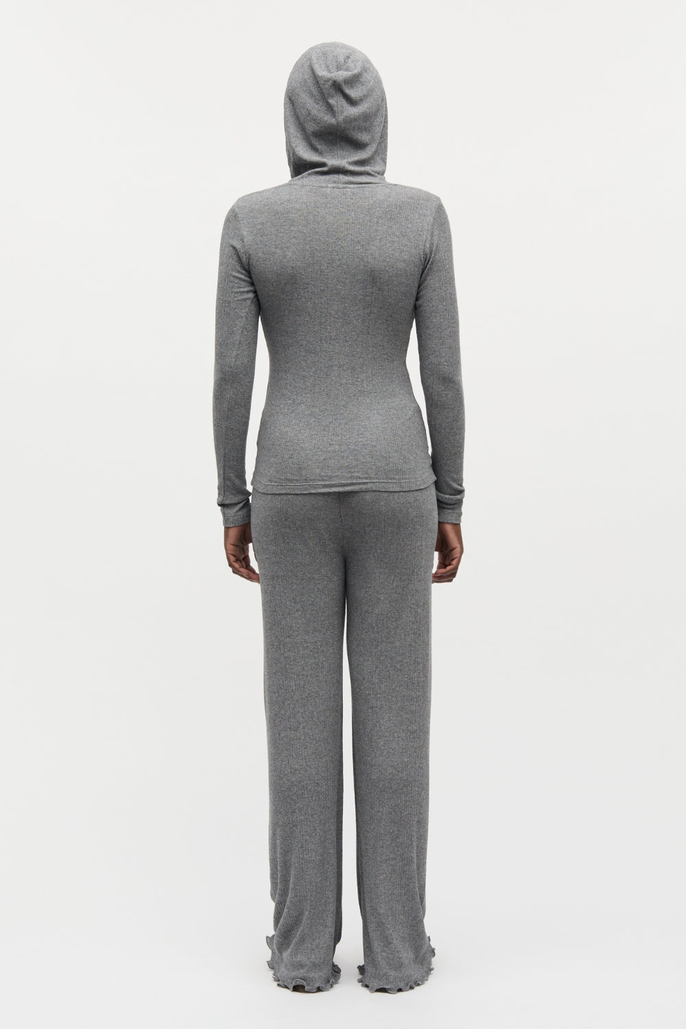 Denne tætsiddende hoodie er fremstillet i et blødt, ribbet materiale, der giver en behagelig og fleksibel pasform. Det minimalistiske design kombinerer en let hætte med lange ærmer og en ren silhuet, som gør den ideel både alene og som lag-på-lag. Et afslappet, men stilrent valg til hverdagsgarderoben – perfekt til både hjemmebrug og casual styling.