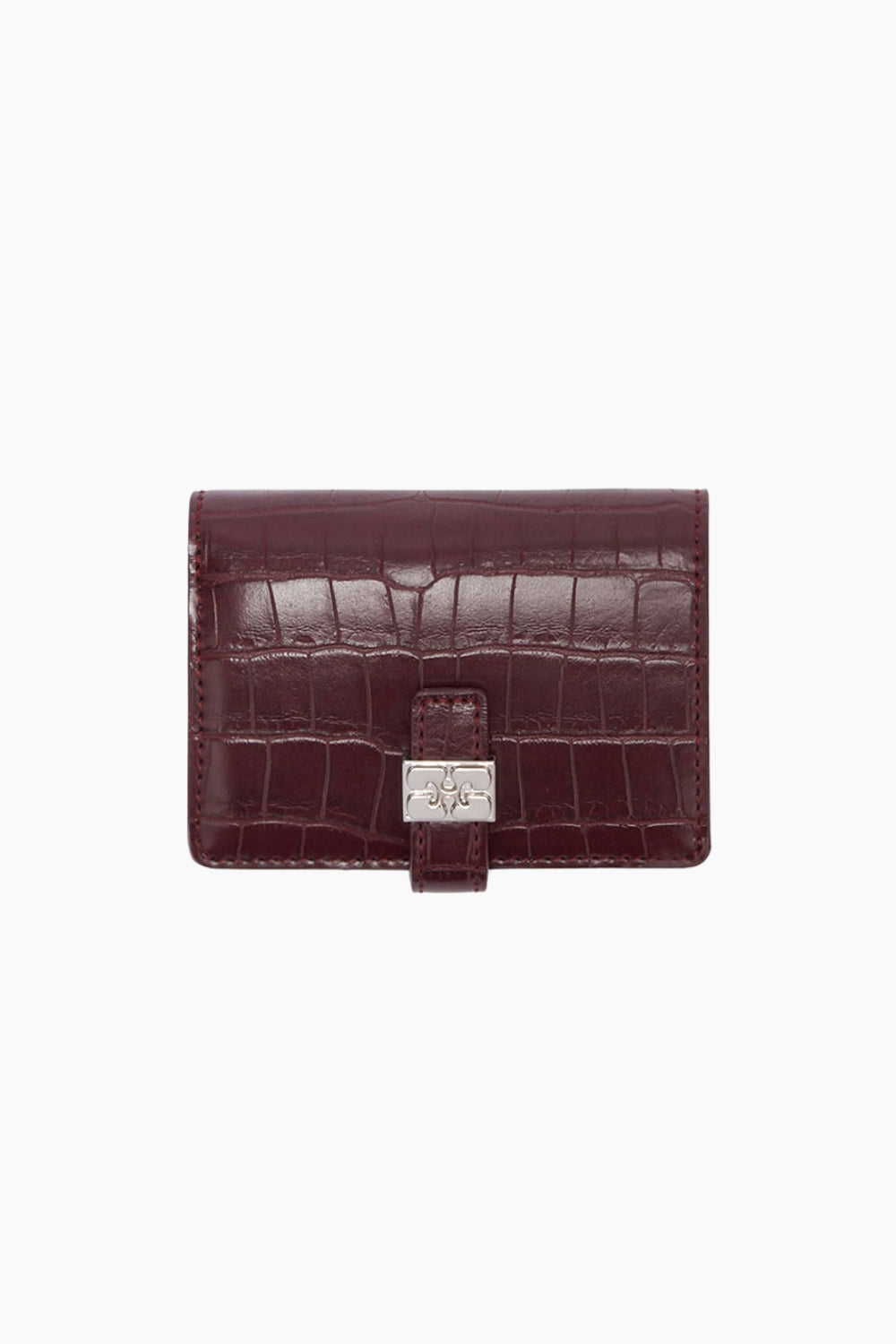 Denne elegante GANNI pung i dyb bordeaux er et tidløst accessory, der kombinerer funktionalitet med et eksklusivt udtryk. Pungen er udført i croco-præget materiale, som giver et luksuriøst look, mens det kompakte design gør den ideel til både hverdag og fest. Den lukkes med en dekorativ metalspænde og åbner op til flere praktiske rum til kort, sedler og småting. Et klassisk valg til dig, der ønsker et stilrent accessory med karakter.