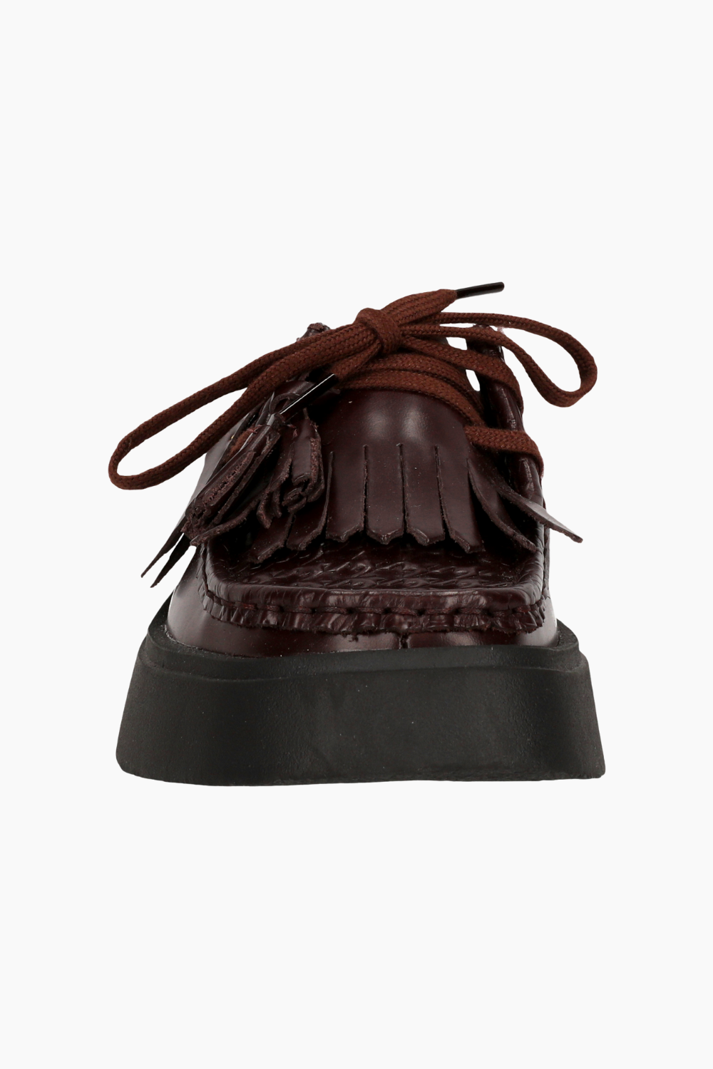 Torview D i bordeaux læder er en moderne fortolkning af den klassiske mokkasin-inspirerede sko. Med sin unikke kombination af elegant glat læder, håndlavet fletdetalje og iøjnefaldende frynser giver skoen et markant og stilrent look. Den robuste, let forhøjede gummisål sikrer komfort og stabilitet hele dagen, mens snørelukningen tilføjer et tidløst og funktionelt touch. Perfekt til både hverdagsbrug og mere formelle anledninger, hvor du vil kombinere komfort med karakter.